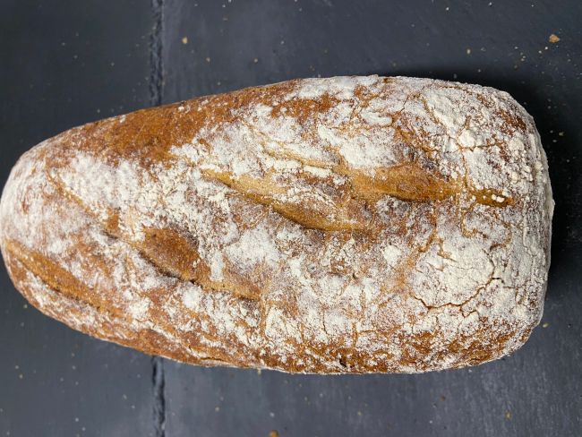 Lyst brød med en smule rugmel samt hørfrø og solsikkekerner i bunden. Pyntet med blå birkes på toppen