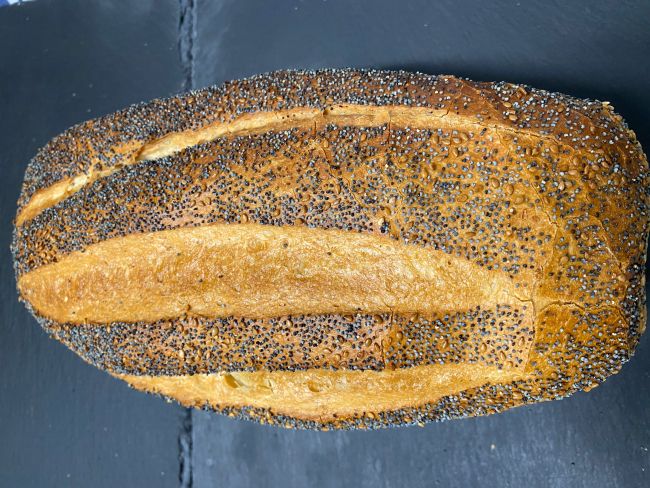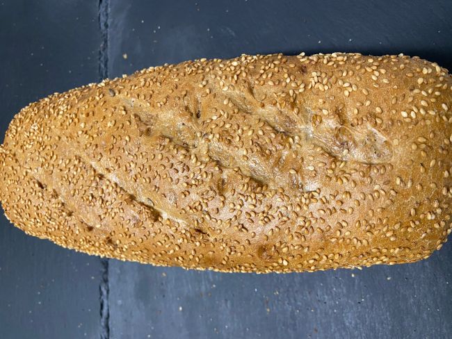 Bagt på fuldkornsmel og sojamel. Ristet sesam, græskarkerner, lidt valnøddestykker, ristet malt. Bagt fritstående.